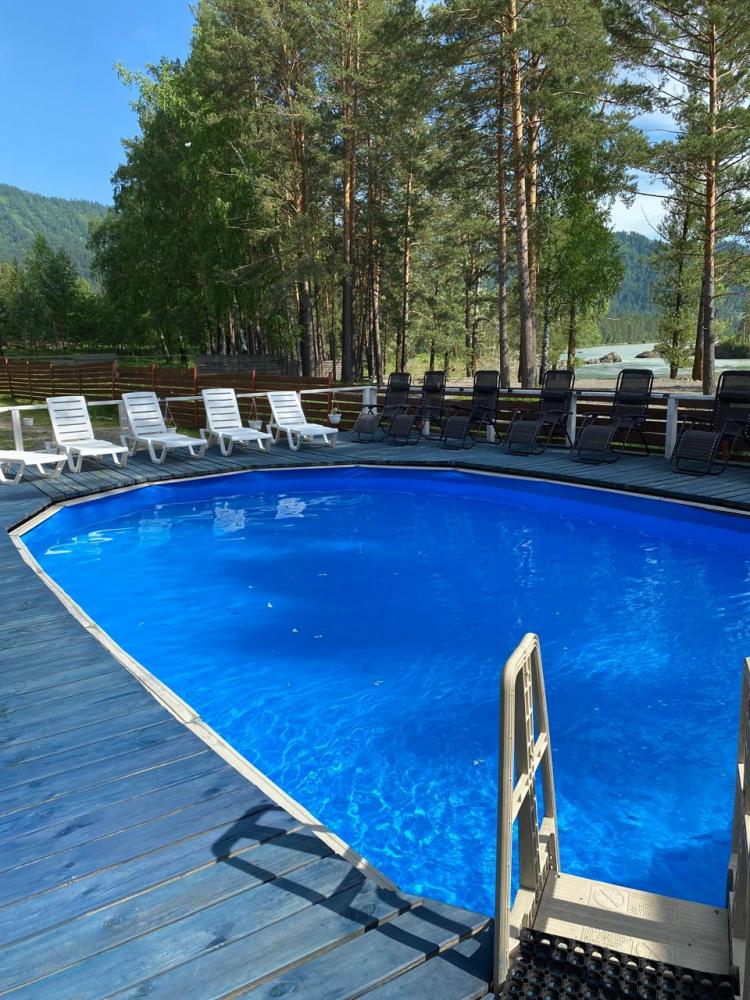 Круглый год 23 номера с панорамными окнами с видом на Катунь, полностью благоустроены (двуспальная кровать, диван, холодильник, чайник, микроволновка, душ, туалет). Бассейн у Катуни и аквапарк в 200 м. Безопасность обеспечивается видеонаблюдением. Круглогодично.