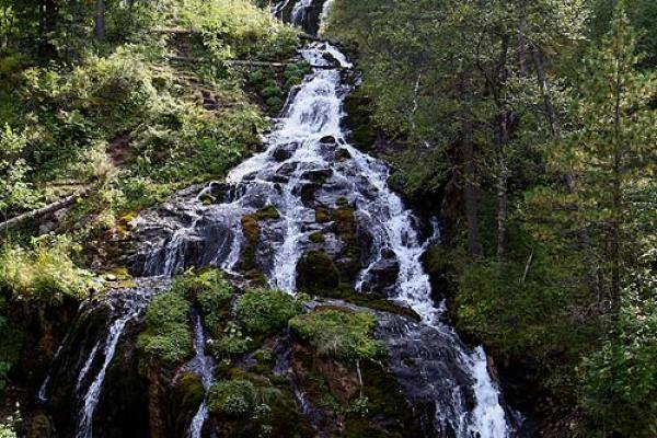 В самом низу водопад расходится на несколько струй, которые живописно стекают по мшистым камням.