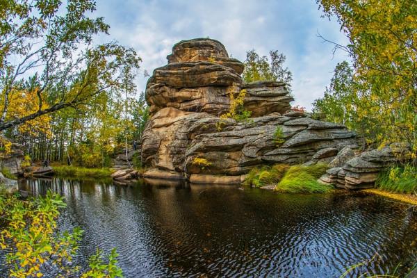 В северной части озера находится скала-останец с площадкой и гротом наверху. По каменистым выступам в северо-западной части этого массива можно забраться непосредственно к самому гроту. Издалека грот напоминает голову птицы, рыбы или фантастического зверя: видны «клюв» (или «пасть»), а также «глаз» в виде углубления в скале. Высота «клюва» более 5 м, а в самом гроте может поместиться компания из нескольких человек. Внутри грота аналогии с «пастью» продолжаются в центре лежит огромный камень с округлыми боковыми стенками, напоминающий «язык», стенки грота имитируют «щеки», переходящие в «зев» и «гортань» узкую щель между камнями, уходящую вглубь скалы. В дни равноденствия солнце появляется утром в пасти «чудовища» и исчезает вечером в ней же. Другой камень размерами более метра, находится в восточной части грота. Вверху грота имеется отверстие-лунка.