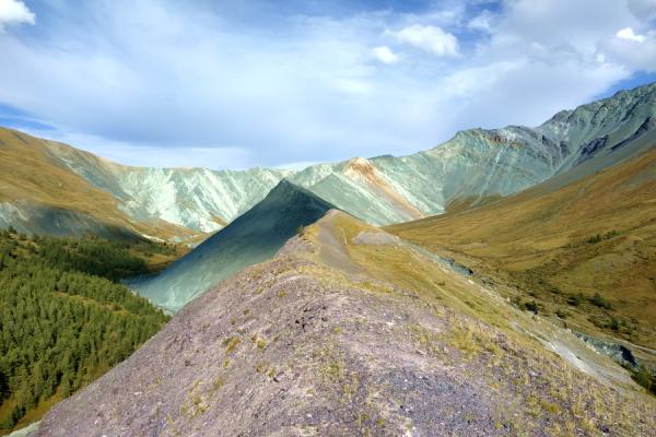 Если смотреть со стороны Аккема, то слева от разделительного гребня есть несколько уютных стоянок среди лиственниц. Справа от разделительного гребня деревьев нет, стоянок тоже нет, зато здесь текут ручьи из родников с прозрачной водой, чего нет в левой долине.