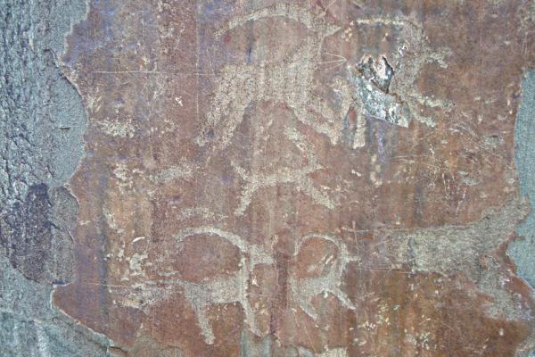 На плитах скальной возвышенности выбиты тысячи рисунков фигур животных, людей, сцен охоты. На большей части петроглифов эпохи неолита представлены крупные фигуры оленей и козлов. Самая многочисленная группа рисунков относится к эпохе энеолита-бронзы; сюда относятся стилизованные изображения женщин (часто рядом со зверем), колесниц, вьючных быков, погонщиков и воинов, фантастических хищников и домашних животных. Петроглифы скифского времени представлены сценами охоты на оленей, многочисленными животными — маралами, козлами, кошачьими хищниками, волками-собаками. На петроглифах древнетюркской эпохи изображены сцены охоты, изображения диких быков и медведей. Здесь найдено единственное на Алтае изображение лодки.