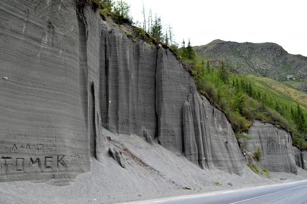 Склон горы почти вертикально срезан и представляет собой спрессованный песок. Под действием ветра и осадков, скала постепенно разрушается и на срезе обнажаются камни. Некоторое время они торчат из скалы, а затем ссыпаются к дороге.