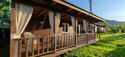 Дом продуман до мелочей! В доме оборудованная просторная кухня (холодильник, микроволновая печь, газ.плита, необходимый набор посуды), большой санузел с душем. В спальной комнате комфортная двуспальная кровать (2 осн. места) и раскладывающийся диван (2 доп. места), телевизор. . Уютная терраса с обеденной зоной, подвесными креслами и отличным видом на горы и территорию — это лучшее место для отдыха и расслабления! Рядом с домом находится беседка с оборудованной кухней и мангал.