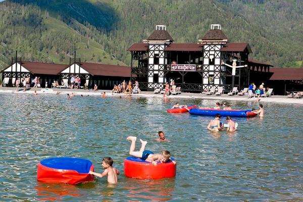 Детская развлекательная территория находится рядом с озером. Это надувные батуты, горки, бассейны. Есть бассейн для самых маленьких с глубиной 20 см, есть бассейн глубиной 40 см. По всей территории расположились лежаки для отдыха взрослых. Дежурят спасатели.