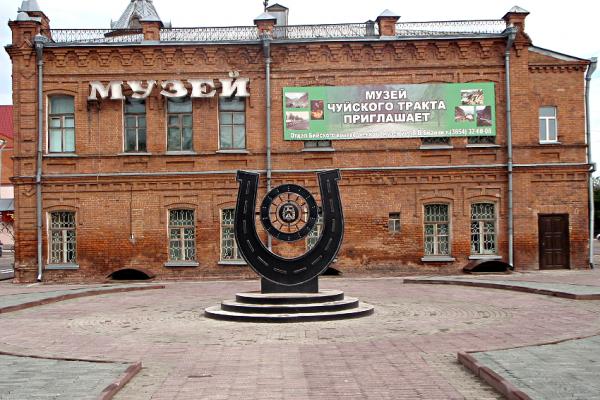 В 2013 году у здания музея установлен памятный знак строителям и водителям Чуйского тракта. Знак выполнен в виде подковы с колесом внутри, что предполагает сразу несколько символических значений: первым средством передвижения по Чуйскому тракту были лощади; на подкове есть разметка, символизирующая изгиб Чуйского тракта; сторона подковы направлена в сторону Горного Алтая, куда ведет легендарная дорога. От здания музея начинается главная дорога Алтая, поэтому это место так и называется — «нулевой километр Чуйского тракта».