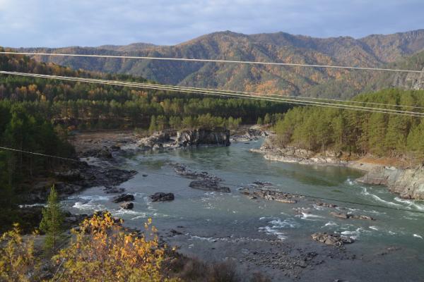 Примерно через 50 метров после того, как река Чемал прыгнула с плотины ГЭС, она впадает в Катунь. Пройдите немного вниз от ГЭС и вы увидите, как темно-зеленые воды Чемала вливаются в матово-серый поток Катуни. На границе двух потоков образуются очень красивые узоры.