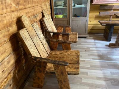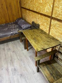 - деревянный столик и лавочки возле домика