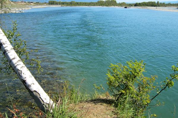 Перейдя по мосту реку Кокса, вы увидите тропинку по берегу среди берез. Вы доходите до протоки Коксы, в сухое время ее свободно можно перейти. Дальше двигаетесь, или держась берега Катуни или берега Коксы, которые в этом месте текут уже очень рядом. С острого мыса видно, как встречаются воды двух рек, двух разных цветов бирюзовая Катунь и прозрачная Кокса. Кокса в этом месте неглубокая, так что видно камушки на дне, русло Катуни, наоборот, глубокое.