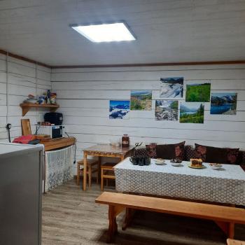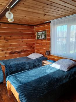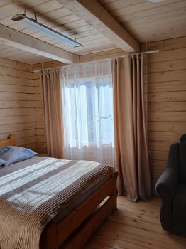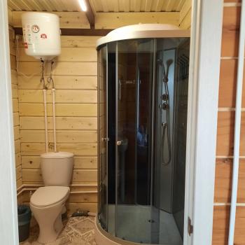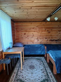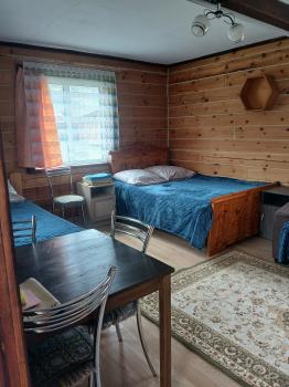 Большая одна комната с печкой. В комнате: двуспальная кровать и раскладной двуспальный диван, односпальная кровать, столик, стулья, чайник, вешалка. Санузел: душ, WC, раковина, водопровод.