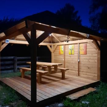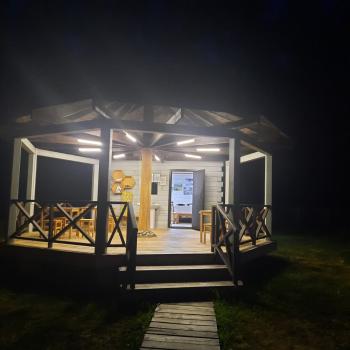 Беседка-кухня: холодильник, электро-плита, микроволновая печь, чайник, мультиварка, раковина, посуда, столовые приборы, большой стол со скамейками, мангал с шампурами и решетками.
