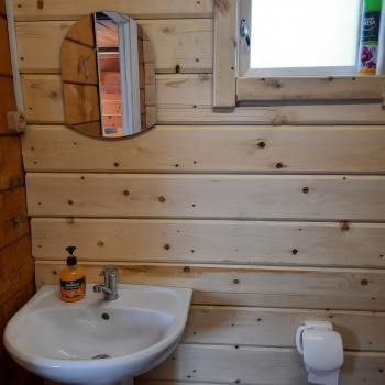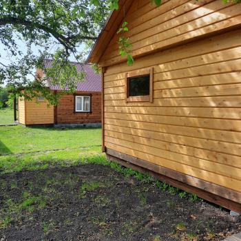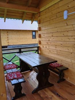 В домике — три односпальных кровати, стол, стулья, чайник. Санузел душ, WC, раковина, водопровод.