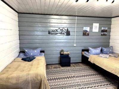 1 двуспальная кровать и 1 полутораспальная кровать, холодильник, эл. чайник, посуда, 4 эл. розетки.