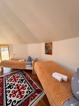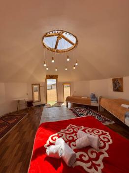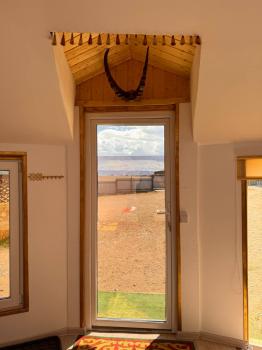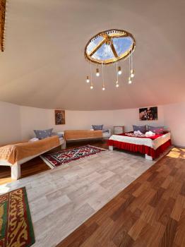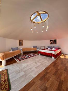 Новая казахская юрта, в которой сочетаются современный интерьер и традиционные элементы, хранящие в себе обычаи и традиции казахского народа. В юрте имеются панорамные окна с красивым видом.