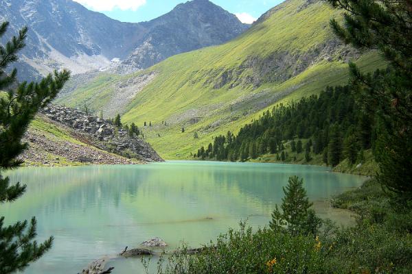 Если идти к началу озера, обходя его справа (левый берег орографически), то тропинки идут среди карликовой березки (обязательно наденьте длинные штаны). В низовьях озера долина почти горизонтальная, между карликовой березки разбросано много больших валунов, растут кедры. Здесь есть хорошее уютное место для небольшой стоянки.