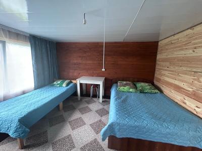 3 кровати (1-двуспальная, 2- односпальные кровати), электроплитка, холодильник, чайники, посуда, стол и стулья.