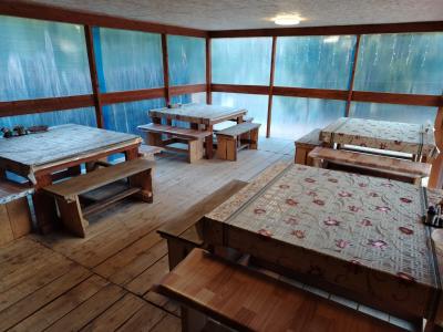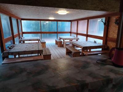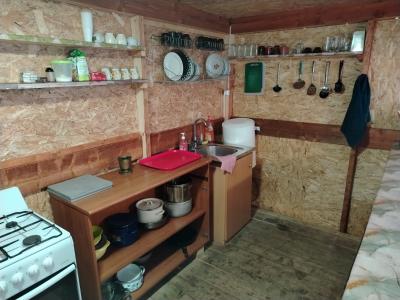 Застекленная столовая-кухня на 20 чел. площадью 100 м2 (2 газовых печи с духовкой, микроволновка, чайник, посуда, горячая и холодная вода).