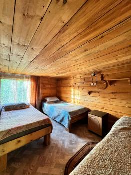 2 односпальные кровати, постельное белье, электричество, розетки. Веранда, стол, скамейки. Домики пихтовые.