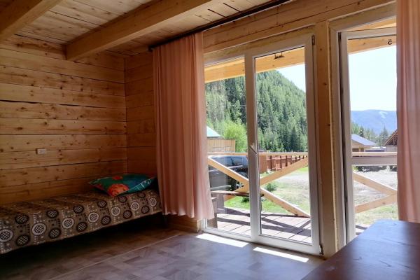 Площадь больше, чем в обычных 4-х местных домиках, панорамные окна смотрят на реку.