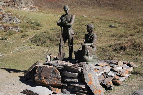 Скульптурная группа памятника - стоящий на постаменте мужчина с лопатой и сидящая женщина. Табличка гласит: Посвящается коренным жителям Алтая, чья история тесно переплетена с историей Чуйского тракта - "дорогой жизни и смерти".