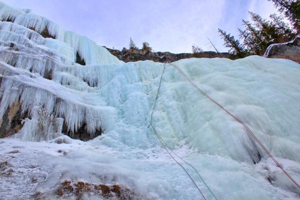 Физически подготовленные ледолазы продолжают восхождение. Полное прохождение ледопада занимает около 2 часов. Спуститься можно по тропинке слева от водопада.