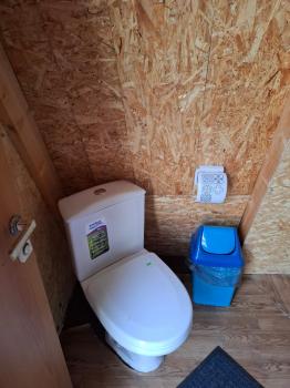 Первый этаж домика: 2-спальная кровать, столик, табуретки, холодильник, чайник. Так же на этаже - туалет с раковиной, душ.