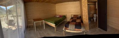 В каждом доме доме 1 двуспальная кровать + 1 односпальная кровать, санузел, душевая кабина, терраса со столиком и креслами, качели.