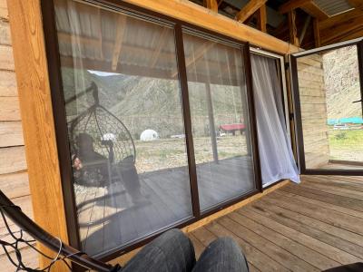 Из панорамных окон вид на Чулышманскую долину и горы.