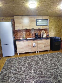 двуспальная кровати, дополнительное место, зона кухни (холодильник, посуда, раковина с горячей и холодной водой, газовая плита 2-х комфорочная, печь-камин