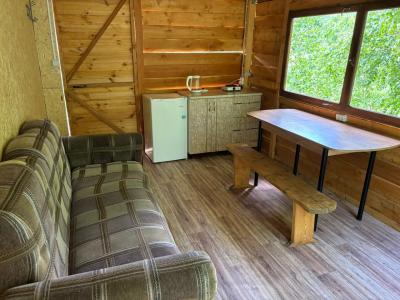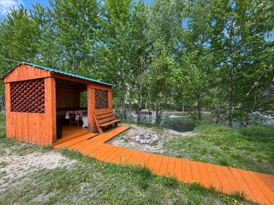 Дом 4-местный с видом на реку c удобствами. Две двухспальные кровати (в одном диван), холодильник, чайник, стол, кресла, мангал, закрытая веранда с видом на реку. Санузел: туалет, раковина. Горячий душ на территории.