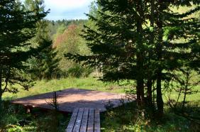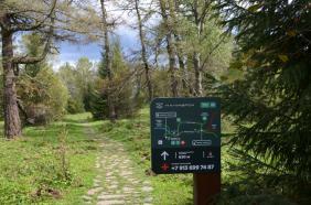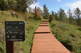 На верхней станции кресельного подъемника Восход, налюбовавшись видами на горы и скульптуру Богатырь Когудей Мерген, вам надо спуститься по указателю Поляна Топшур. Так же по Тропе Легенд можно пройти, если вы поднялись на подъемнике Ледник, а затем на Софие.