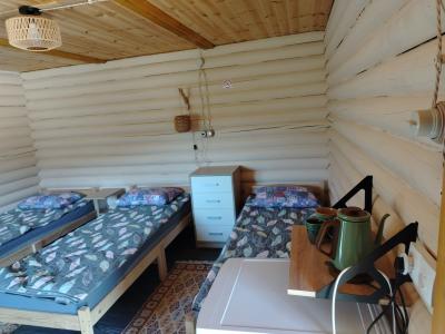 В спальне три односпальные кровати 80х200 см с очень удобными матрасами, комод, холодильник, чайный уголок, прикроватные столики, кресло, табуретки, зеркало, вешалки и розетки на 220В. Дома оборудованы обогревателями.
