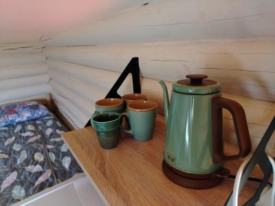 В кухне-гостиной с панорамным окном на Катунь расположена кухонная зона со всем необходимым для приготовления еды, холодильник, а также обеденная зона и релакс-уголок с мягкими пуфиками. Обогреватель и печь-камин согреют в прохладные осенние ночи. Есть розетки 220В (только для зарядки гаджетов).
