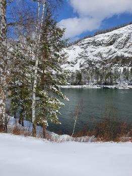 Мы находимся прямо на берегу Катуни. Перед нами река, за нами лесок, рядом никого, за оградой только горы, простор, лошадки и коровки.