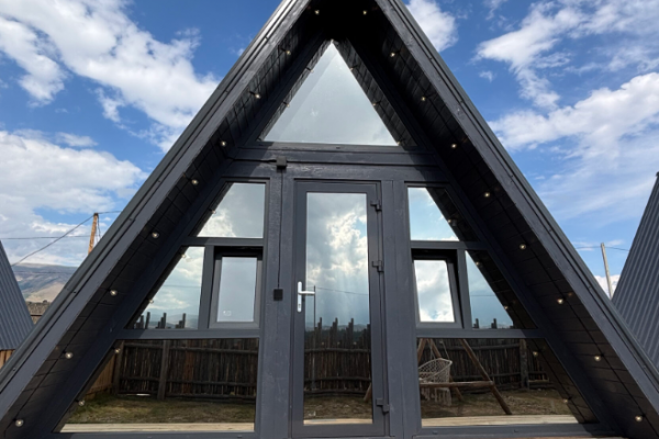 Дома А-фрейм с панорамными окнами на гору Актру, все удобства - душ, микроволновая печь, холодильник, плитка, все столовые приборы (вилки, ложки, кастрюли, сковорода, ножи, кружки, тарелки, супницы и т.д.)