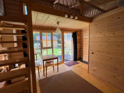 Двухэтажный. Двуспальная кровать, односпальная кровать, раскладной диван (доп. место), кухонная зона, холодильник, wifi, фен, обогреватель, полотенца, своя терраса.