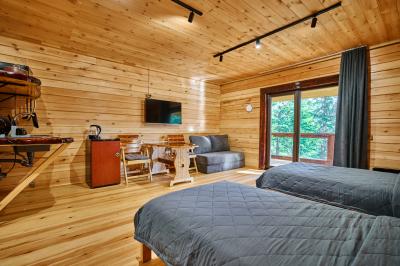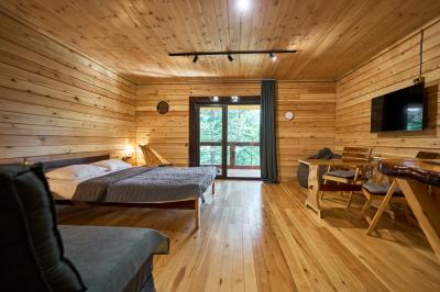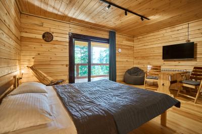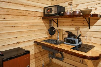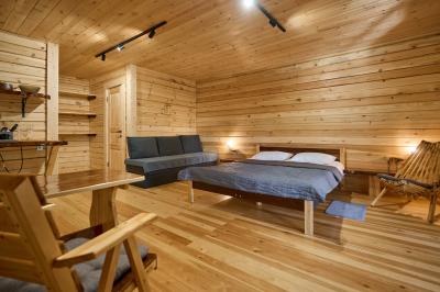 Кровать с ортопедическим матрацем и отельным белоснежным бельем страйп-сатин. Подушки и одеяла из искусственного лебяжьего пуха. На кухне столешница из массива кедра, варочная индукционная поверхность и посуда для нее, микроволновая печь, холодильник, столовые приборы, эл. чайник, немецкая глубокая раковина из нержавеющей стали с лотком для овощей и фруктов, дозатор с моющим средством. В санузле столешница из массива кедра, раковина – чаша с донным клапаном, дозатор с жидким мылом, набор больших плотных махровых полотенец на двух гостей, душевая кабина, унитаз. Все смесители качественные, Gappo. Стулья и обеденный стол из массива дерева и два шезлонга с подушками.