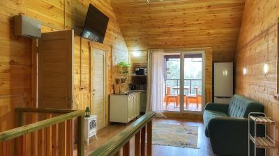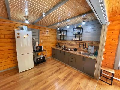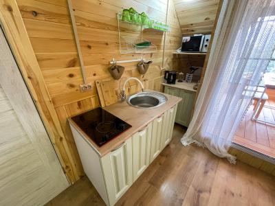 - большая кухня-гостиная с телевизором, плитой, микроволновкой, чайником, кофеваркой и посудой;