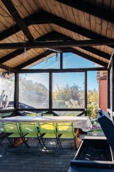 Дом построен из рубленного кедра, разделен на 2 половины: