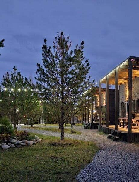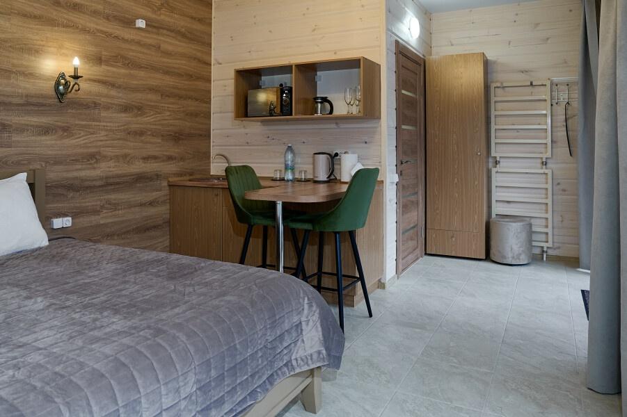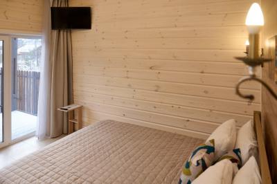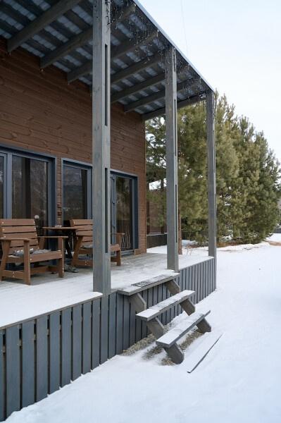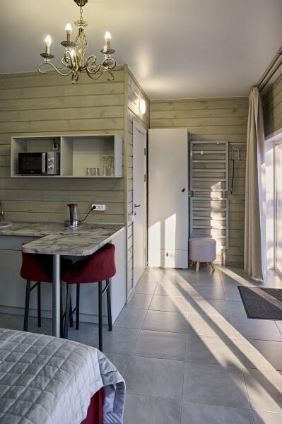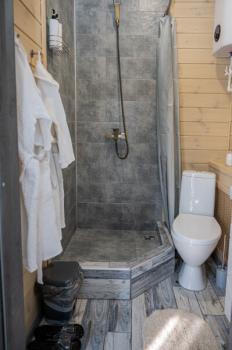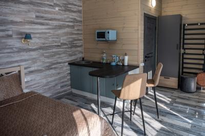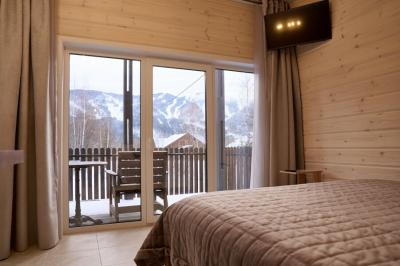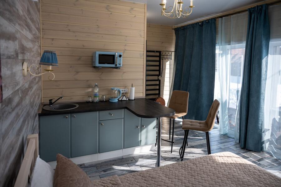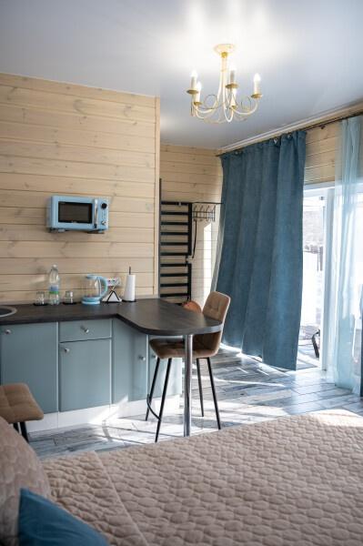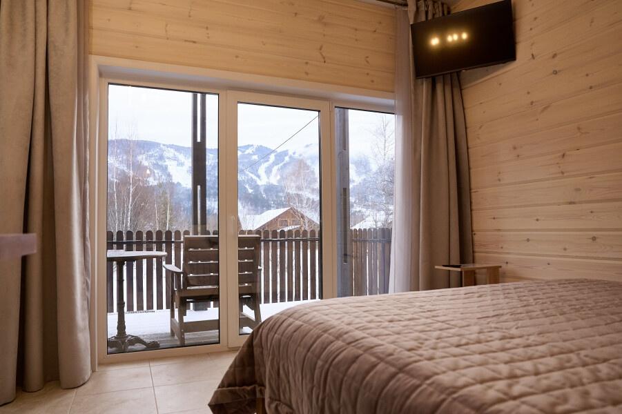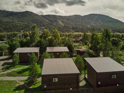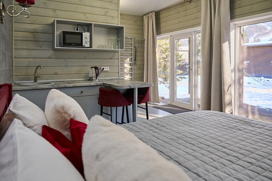 Для размещения отдыхающих предлагаются отдельно стоящие одноэтажные круглогодичные гостевые домики с панорамными окнами и верандами, с которых открывается прекрасный вид на горы как летом, так и зимой. В каждом домике есть санузел с душевой кабинкой, мини-кухня.
