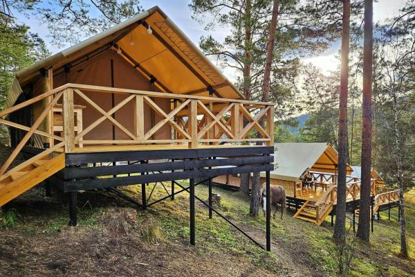 Для размещения гостей предлагается несколько летних благоустроенных домиков-шатров, в каждом из которых есть оборудованная кухня с обеденной зоной и санузел с душевой кабиной. Питьевая вода из скважины, сотовой связи нет, но есть бесплатный Wi-Fi.