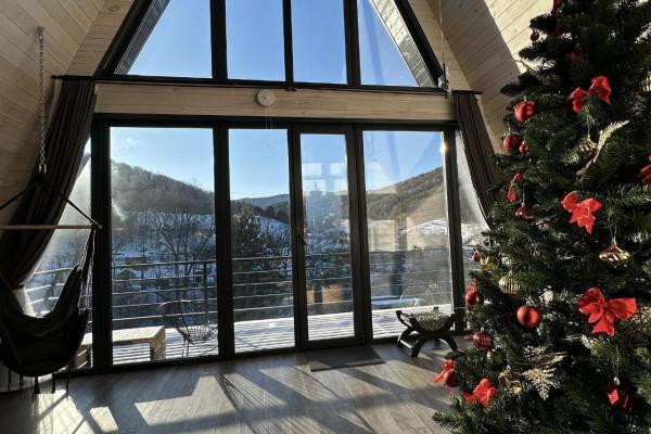 Комфортабельный дом A-frame, на 1-м этаже которого расположена кухня-гостиная с обеденной зоной и панорамными окнами с видом на горы, холодильник, индукционная плита, микроволновая печь, чайник, кофеварка, вся необходимая посуда, тостер, а также кондиционер, санузел, душ, угловой диван (полноценное двуспальное место), комната с двухместной кроватью. На 2-м этаже комната с двухместной кроватью и кондиционером.