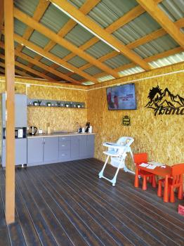 Газовая плита, холодильник, чайник, микроволновая печь, вся необходимая посуда, телевизор, детский уголок, столы и лавочки.