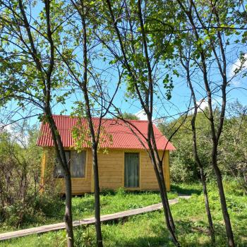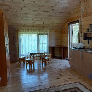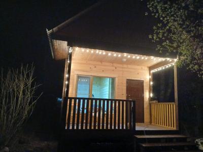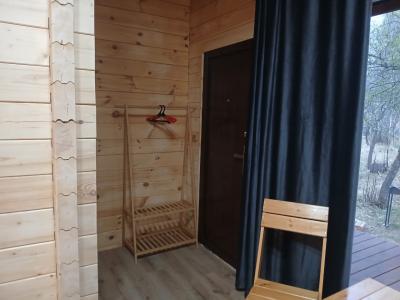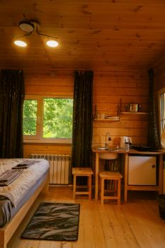 Дом с панорамным окном и террассой: две односпальные кровати трансформируются в двуспальную, душевая комната, холодильник, шкаф, набор посуды, чайник, индивидульный банный чан (опция), стол, скамейки, мангал. Стоимость проживания