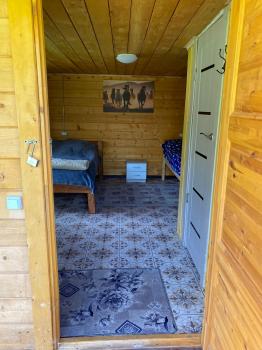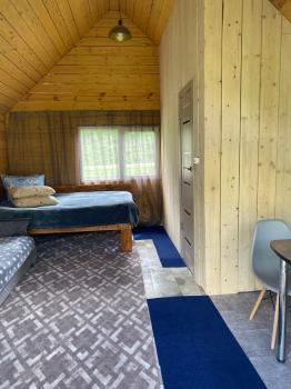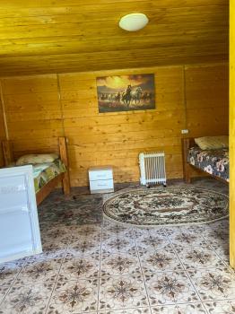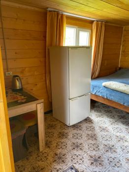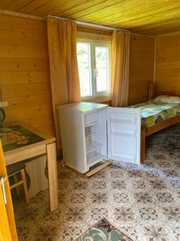 5 уютных домиков, внутри есть всё необходимое для проживания: холодильник, тумба, удобные кровати, постельное белье, стол, стулья, обогреватель, эл. чайник, посуда.