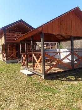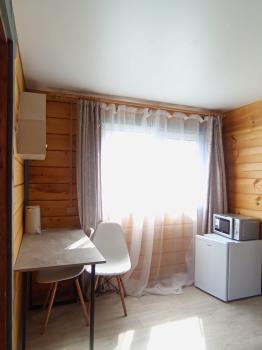 - Домик на 5 спальных мест. На первом этаже домика расположена кухня с чайником, микроволновкой, холодильником, есть необходимая посуда, телевизор, утюг.