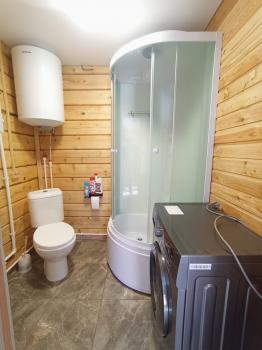 - В каждом домике санузел с душевой кабиной и стиральной машиной, с туалетными принадлежностями и зеркалом.
