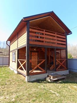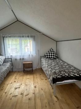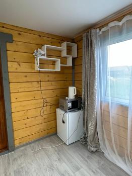 - Домик на 6 спальных мест. На первом этаже домика расположена кухня с чайником, микроволновкой, холодильником, есть необходимая посуда, телевизор, утюг.