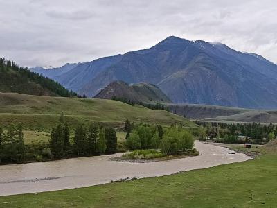 Дома у реки Чуя с красивым видом на горы Алтая с вершиной Актру.