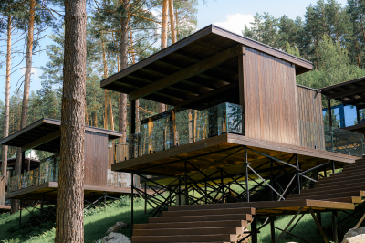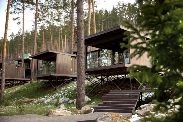 Эти "парящие дома" находятся на склоне, благодаря чему гостям открывается очень эффектный панорамный вид на реку, горы и сосны. Дом возвышается на пять метров от береговой линии и словно парит над территорией отеля.