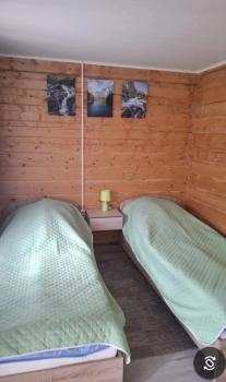 В номере две 1-спальные кровати, кресло-кровать, шкаф, вешалка. Вход с улицы. На террасе диванчик.